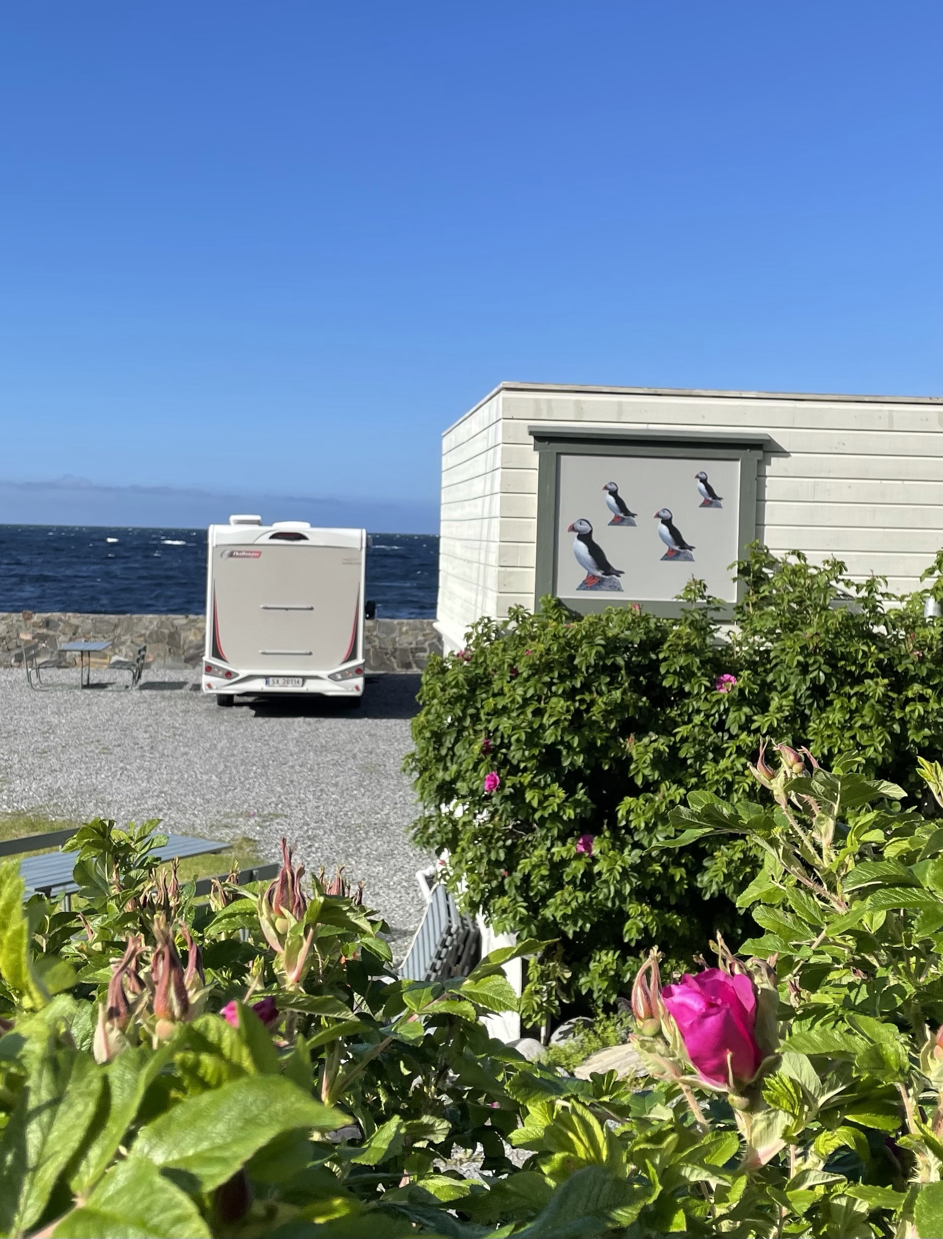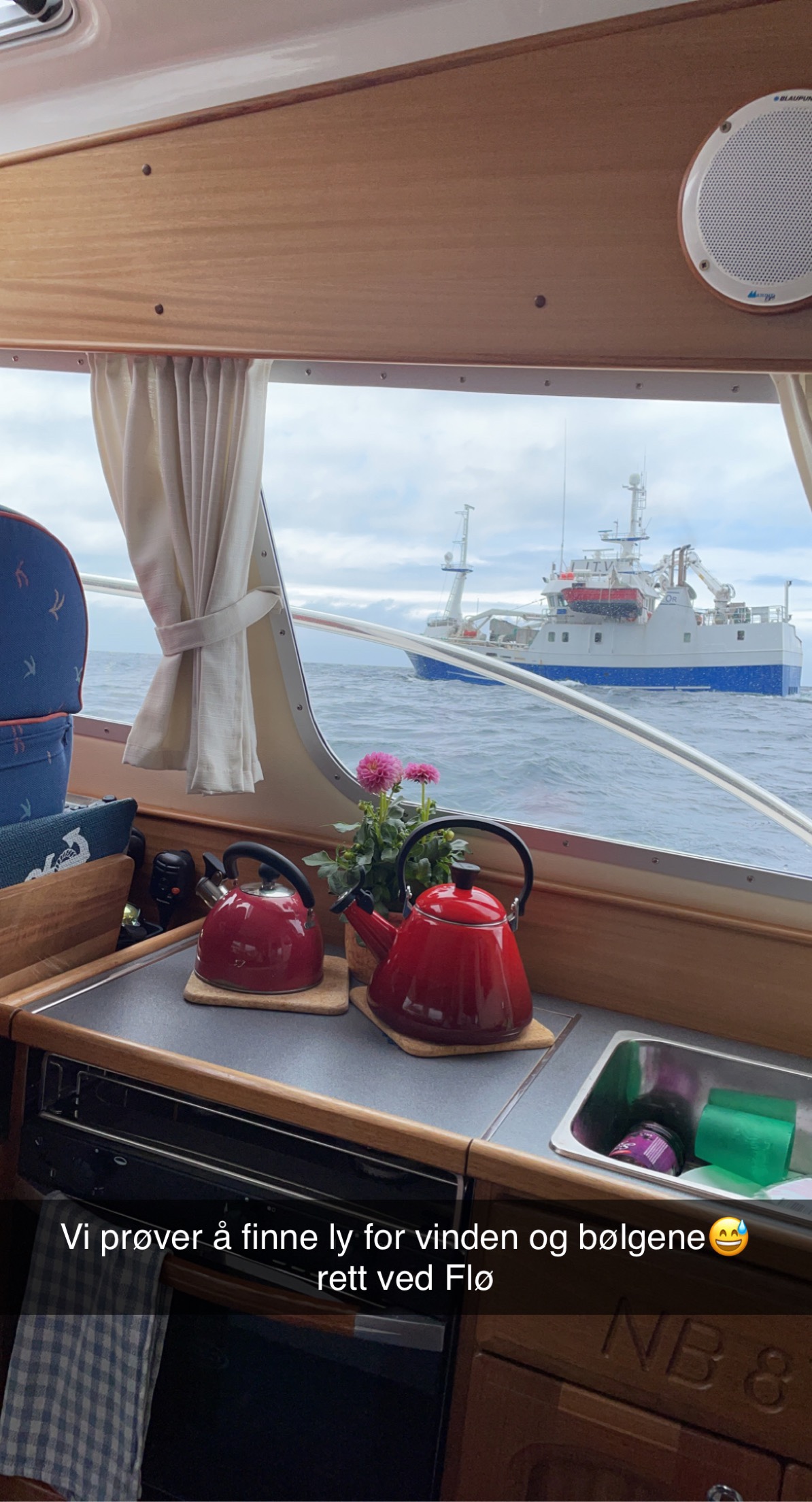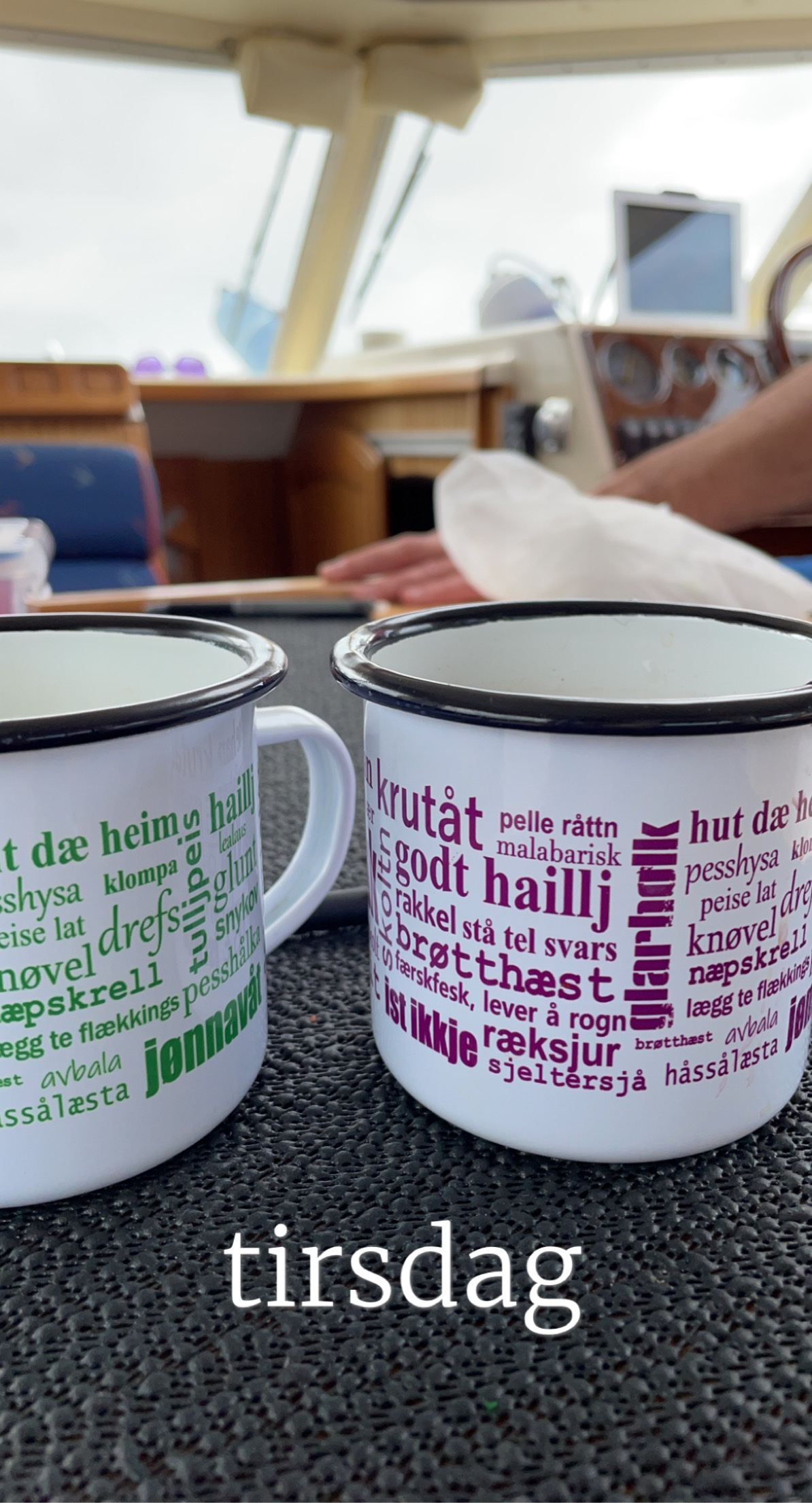 Bilde 1: En lykkelig kaptein er endelig i gang med den store reisen sørover (som har vært planlagt i månedsvis)! Bilde 2: Vi prøvde å fine ly (men det hjalp lite…..) Bølgene tok godt, og Lars måtte fokusere på styringa hele tiden. Men det føltes aldri utrygt eller ubehagelig (bare litt:) Bris II tåler imidlertid langt mer enn det vi tåler (orker)! Bilde 3: Fine turkopper kjøpt av Elin i gave til Lars sommeren 2020. Kan du alle de nordnorske uttrykkene? Bilde 4: Vel fremme på Runde. Godt å være i havn!Litt usikker på om denne playa´en frister til bading… Men utsikten var fantastisk. Vi rusla innom Runde Miljøsenter (inkl. et museum med utstilling om Rundeskatten), en byggplass med to hus under oppføring helt nede i fjæra mot vest (!!), via Christineborg Gjesthus AS, gjennom en tunnel, forbi Goksøyr Camping hvor vi snakka litt med eieren (som virket ganske oppgitt etter korona-svikt i antall besøkende), før vi fant stien på vei opp mot Rundefjellet. En sikker ting er at det er maaaaange sauer på Runde!
