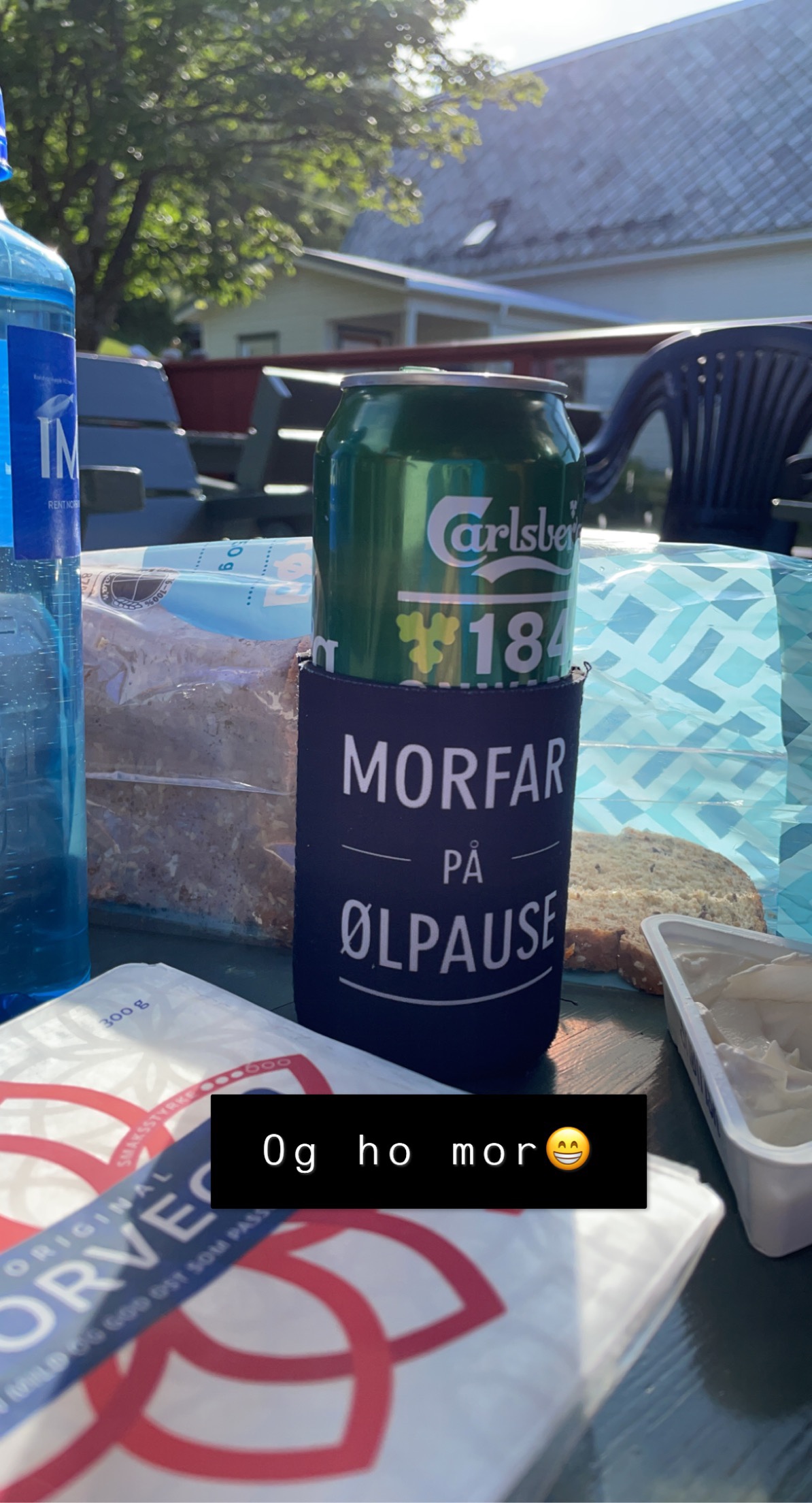 Av en eller annen (uforklarlig…) grunn tok vi ikke med niste på turen vår på Runde (én appelsin og litt vann var litt i underkant av hva kroppene våre trengte…). På vei mot vestsiden av øya hvor oppstigingen til toppen starter, gikk vi forbi en campingplass med en liten butikk. Varmmat hadde de ikke, men brød og ost gjorde susen. Og så hadde jo Lars husket å ta med en kald øl. Etter litt mat og drikke var vi fulle av energi.