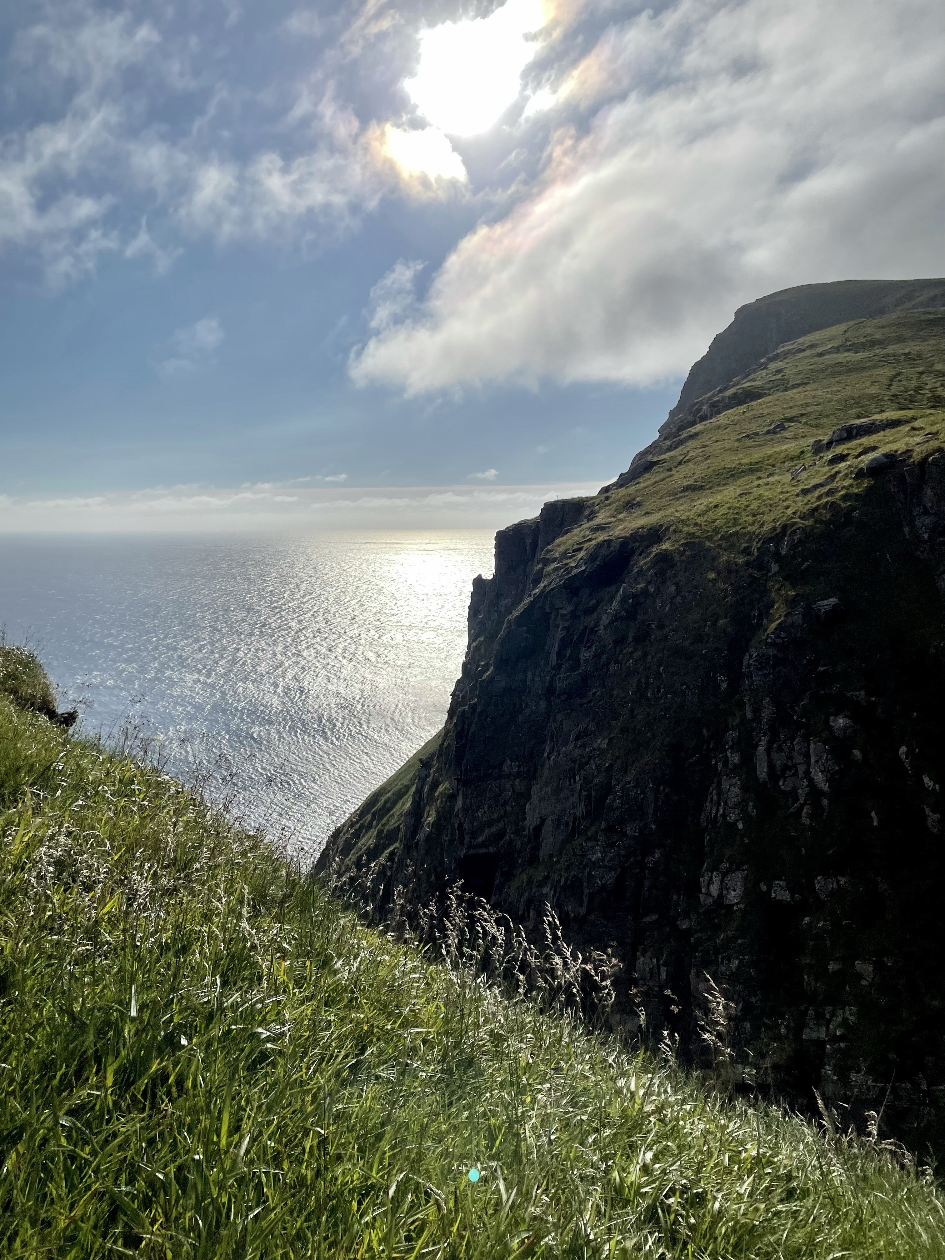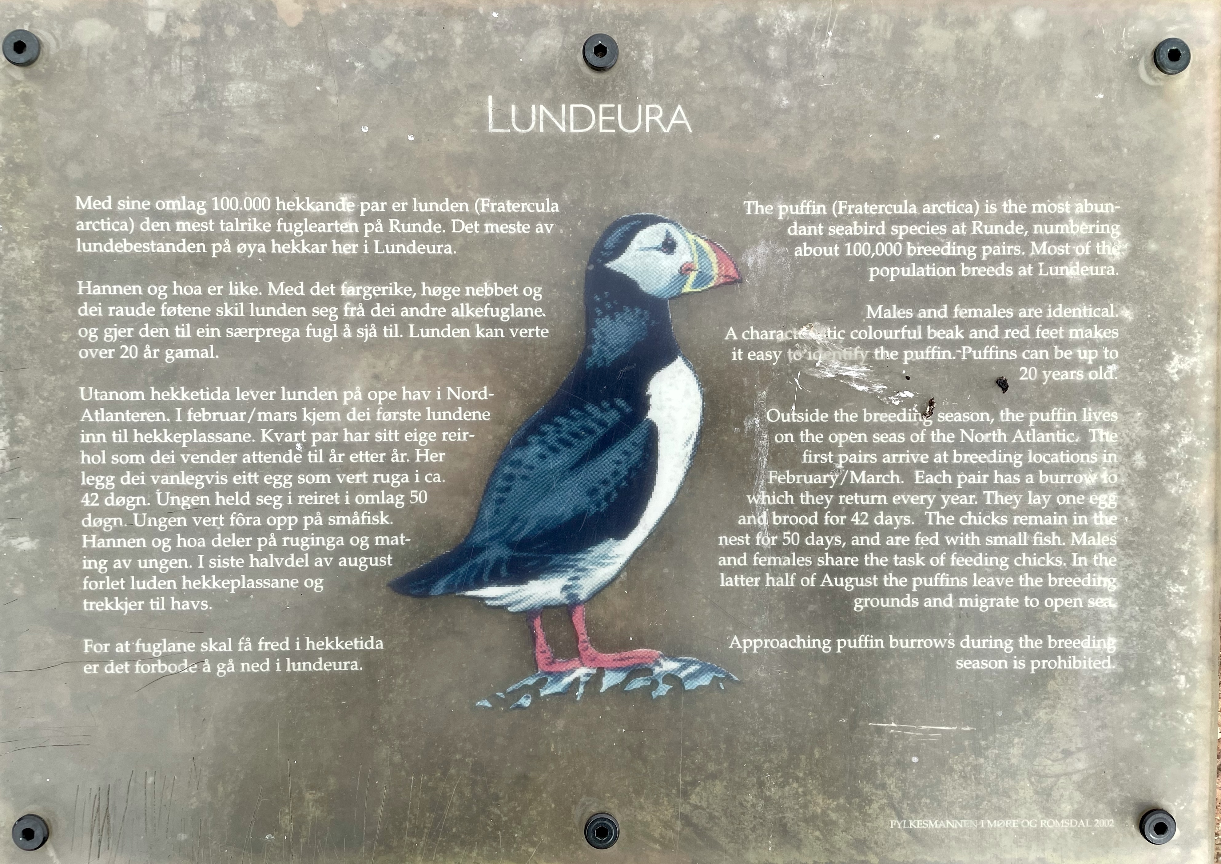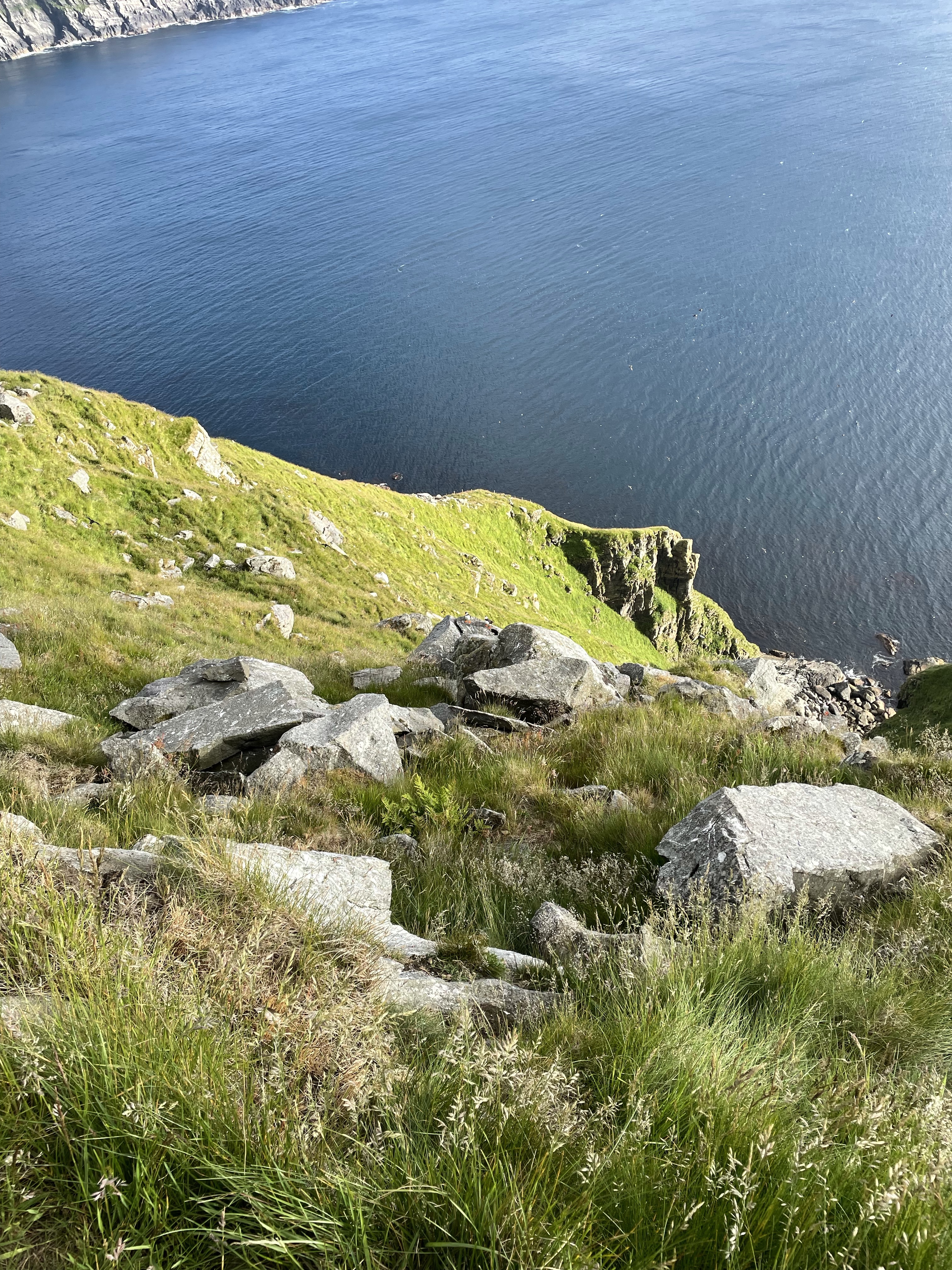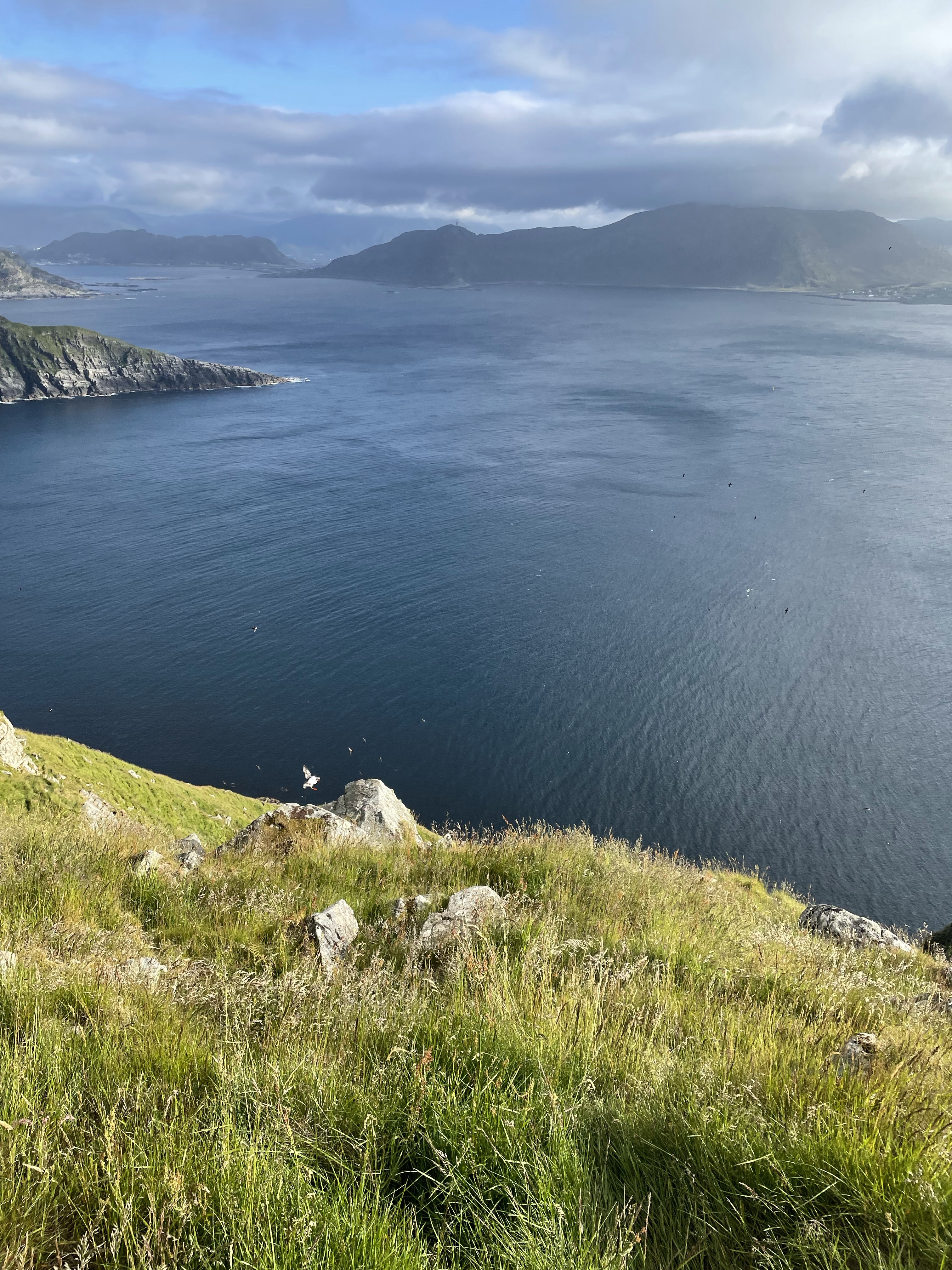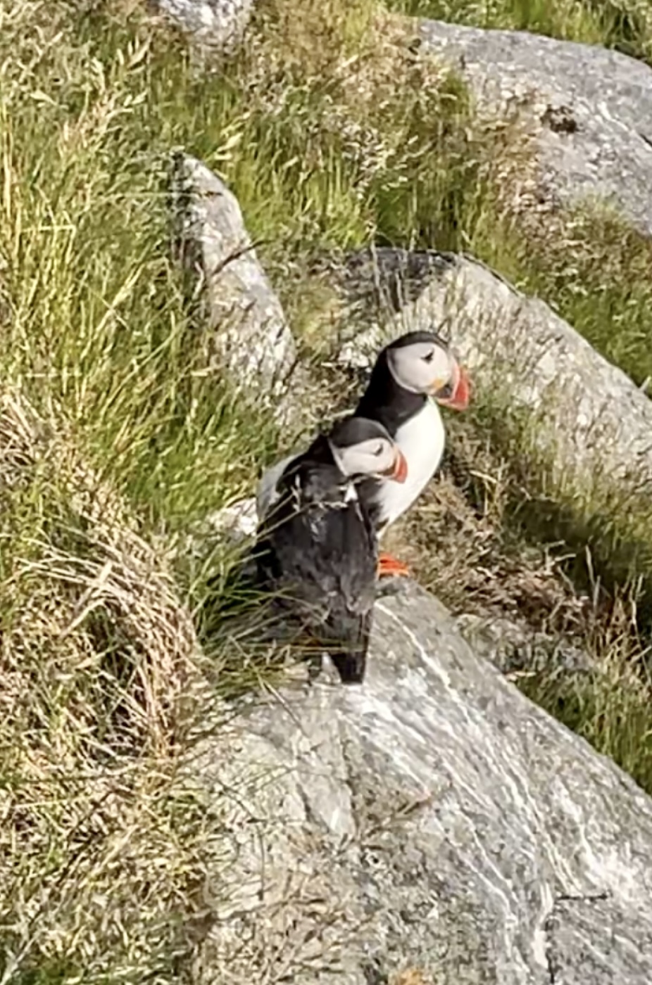 Turen opp på Rundefjellet ble veldig fin med jevn stigning. I og med at klokka allerede var ca. 20 hoppet vi over rundturen rundt fjellet, men satte kursen rett mot det området vi håpet å se lundefugler fra. På vei opp gikk vi forbi et reir med en Storjo på ruging, like ved stien. Heldigvis lå den i ro (bare vi gikk raskt forbi…. den så litt olm ut). Vel oppe på fjellet kunne vi skue et fuglefjell langt i det fjerne, hmmm, var det alt? Vi observerte noen unge jenter som gikk videre, forbi et “byggverk” i fjellsiden (som viste seg å være en passasje for å komme forbi en klippe). På andre siden var det allerede 10-15 stk fugletittere på plass. Noen med stoooore kameraer. En kunne fortelle at lundefuglen ligger på reiret i 42 døgn, for deretter å mate ungene i inntil 50 døgn. For en innsats! Ca. 100.000 par holder til på Runde. Hver kveld kommer de inn med mat til ungene. Når vi kom var det allerede mye fugl i fjellet, men vi kunne også observere mange nede på havet – som fortsatt sanket mat til sine små. Å se disse flotte fuglene på nært hold var en opplevelse!