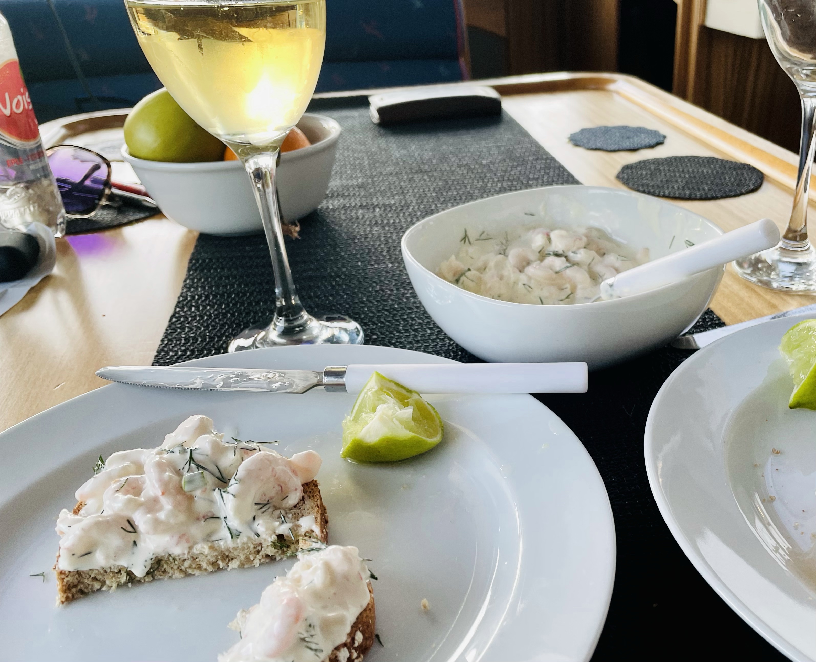 I stedet for restaurantbesøk (som alle var havnet i skyggen) laga vi kveldsmat i båten (hvor vi hadde sol lenge…): «rekecoctail» på skive og hvitvin smakte utmerket😊😁