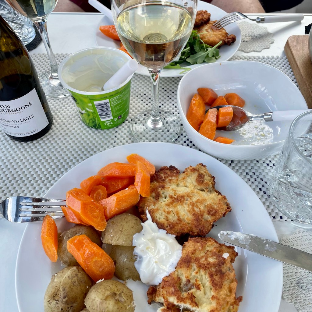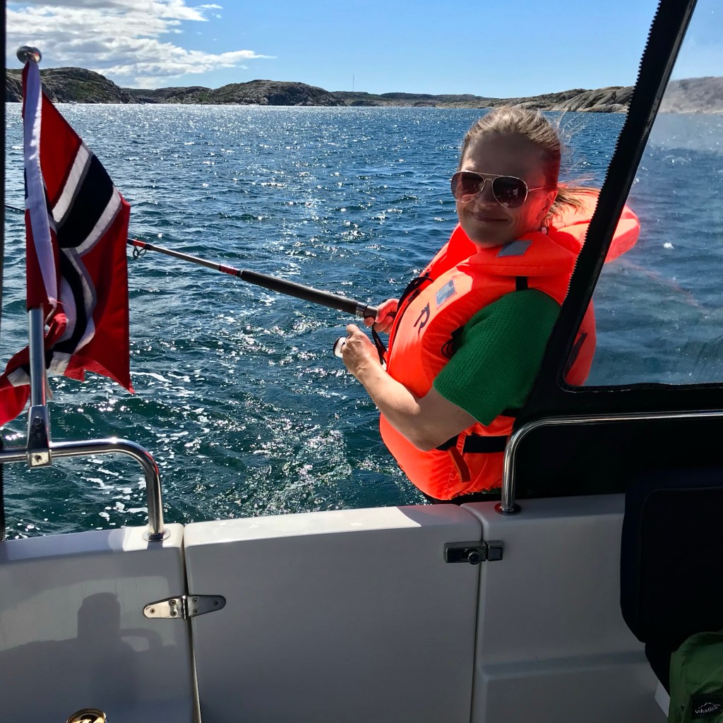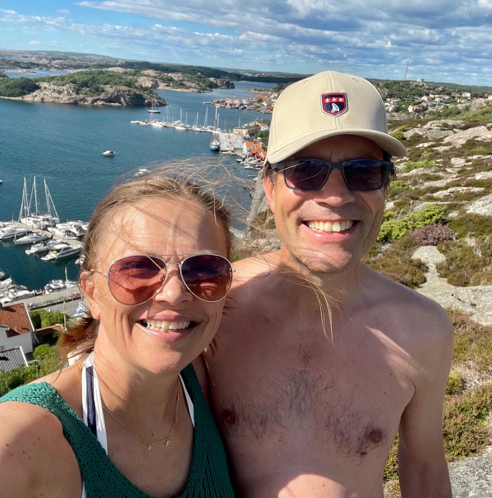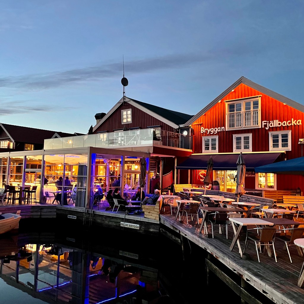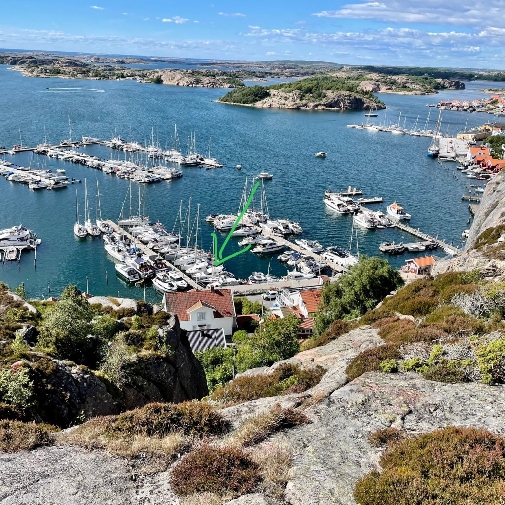 Vel fremme i Fjällbacka ca kl 14 var vi sultne… og uten egenfanget fisk… fant vi en lokal fiskebutikk som bla solgte fiskekaker. Aldeles nydelige med svenske nypoteter og norske gulrøtter👏🐟👏 Utsikten fra båtplassen er perfekt.