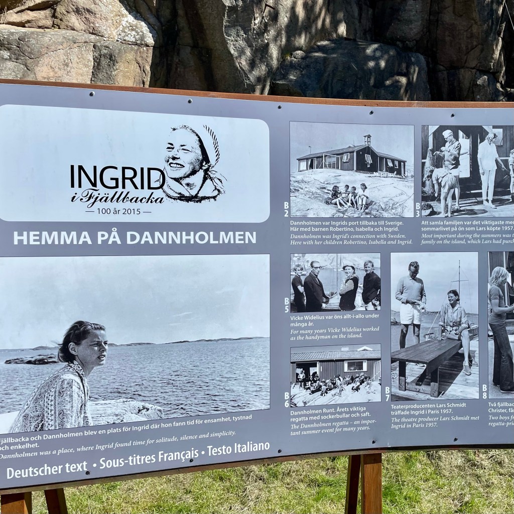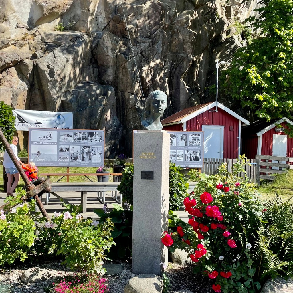Etter lunsj og etter en god hvil, gikk vi en tur for å sjekke ut stedet. Fjellbäcka er nok mest berømt for Ingrid Bergman som tilbrakte mye tid på sitt «smultronstelle», når hun var her i Sverige. Første stopp var Ingrid Bergmans Torg, med statue og presentasjon av den svenske skuespilleren. Den vakre bysten av henne er hugget ut i stein fra Danholmen, og hun skuer ut mot øya hvor hun tilbrakte alle sine somre som voksen.